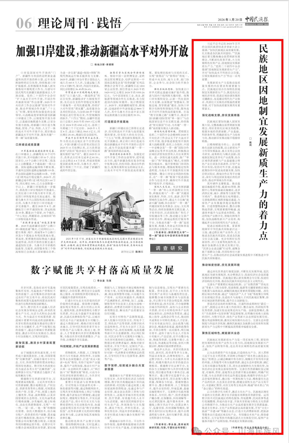 1月20日,《中国民族报》刊发我院教师姚闯理论文章《民族地区因地制宜发展新质生产力的着力点》。该文是学院师生深入学习贯彻党的二十届四中全会精神、立足民族地区发展实际开展理论研究的最新成果,为民族地区培育和发展新质生产力提供了针对性思考与对策建议。