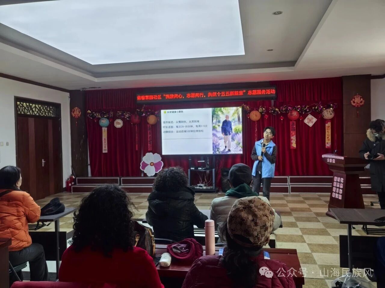志愿服务环节中,志愿者们分工协作、有序开展多项便民服务,带领社区居民练习健康保健操,细致讲解动作要领,帮助居民提升健康素养;开展“银龄数字助老”服务,手把手教会老年人使用手机智能软件,耐心解答日常操作疑问;同时配合社区便民服务区开展健康筛查,普及反诈及民法典相关知识,为居民筑牢健康与法治双重防线。